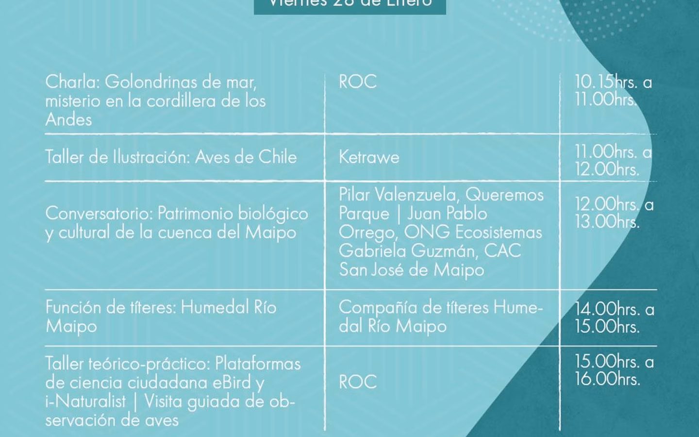 Te invitamos a participar los días 28, 29 y 30 de enero del 2022, en la primera versión del Festival de Aves del Maipo 🥳, que busca promover la protección y defensa de la cuenca del Maipo poniendo en valor su extraordinaria diversidad biológica y cultural.🦅🌱